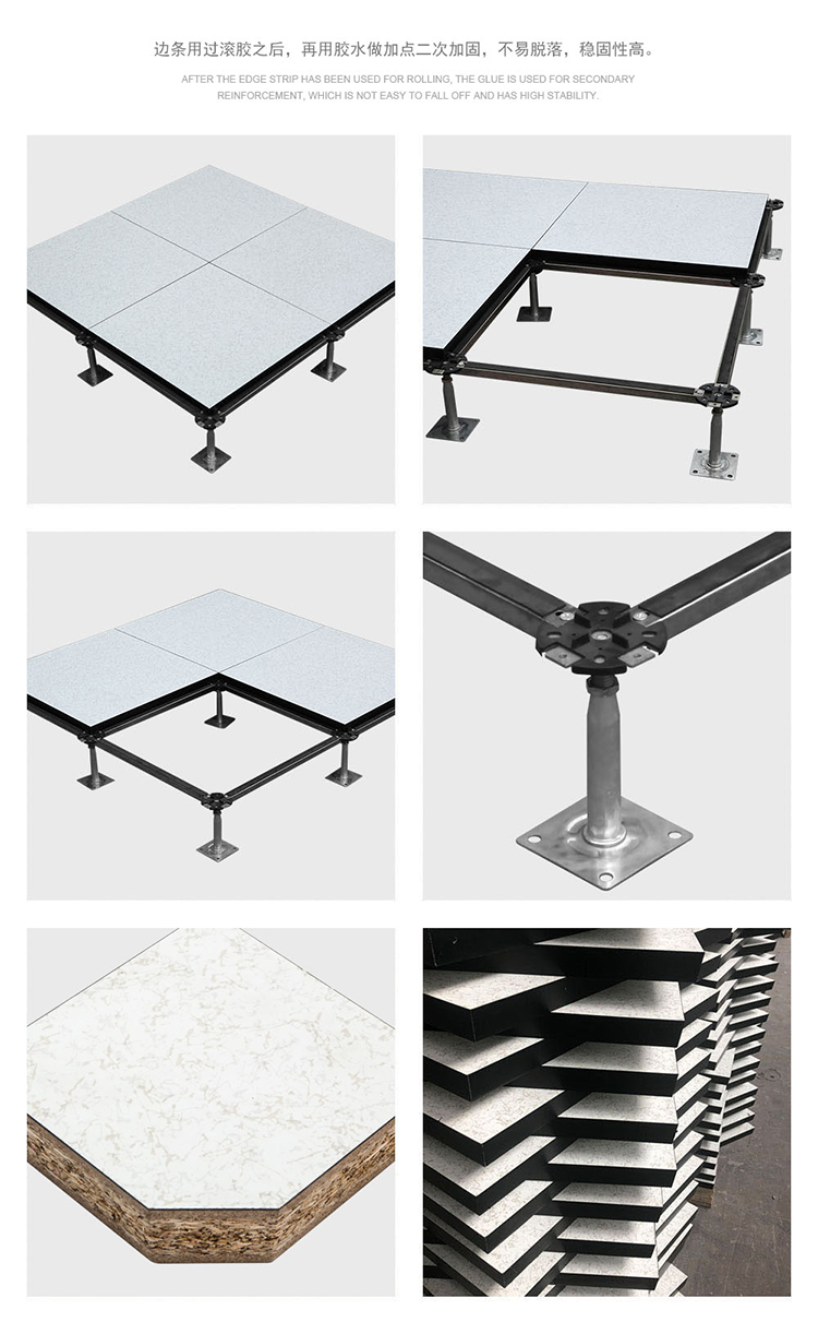 欧式复合地板,板芯采用、未经加工的中高密度刨花板基,上面粘贴HPL(防火板)、PVC、陶瓷、等不同装饰面层,下面粘贴镀锌钢板/铝板/铝箔,四周导静电黑胶条封边,阻止机械损坏及潮湿变形。通过阻燃剂的添加,使其达到B1级防火,且具有较轻的自重,达到更高的承载能力和环保水平,标配出口型加重配件。