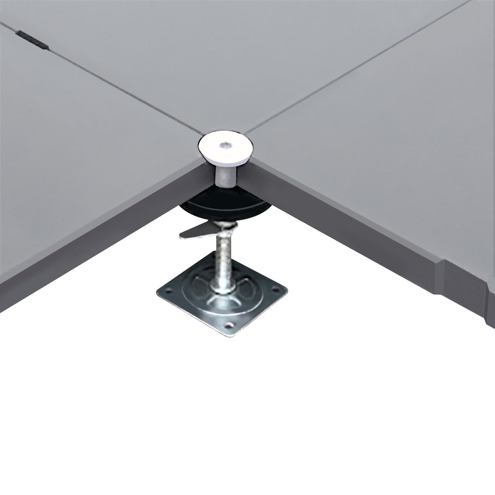 地板四角镀锌底座支承,不带横梁系统。每块地板四角有90°圆弧,四块板组合而成后形成一个圆,有一个铝制螺母压角固定。