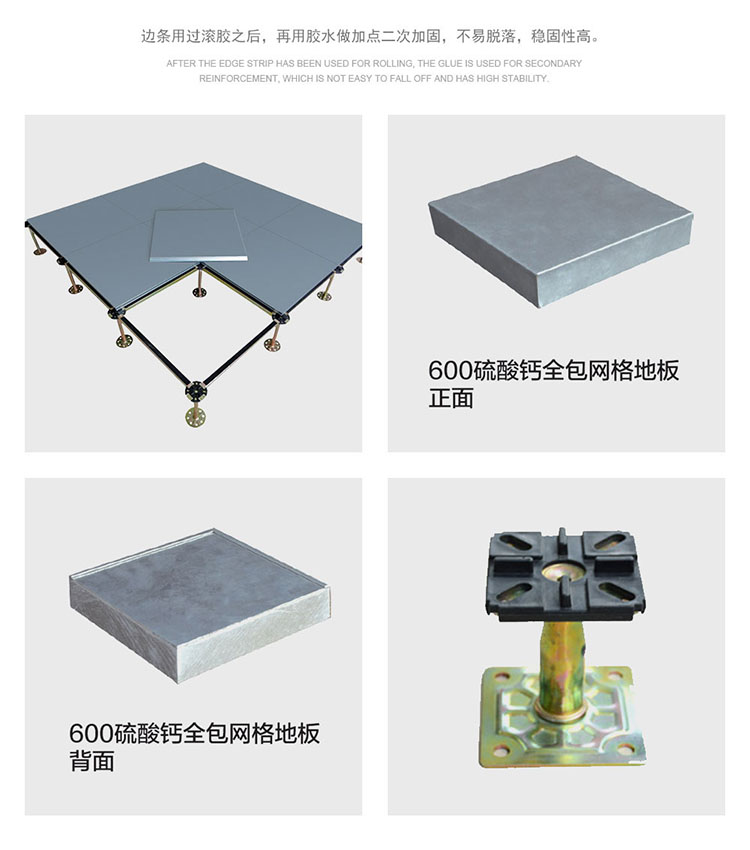 硫酸钙网络地板采用硫酸钙为基材,板芯六面均用镀锌板包合而成,地板不易受潮,不易变形,耐燃烧时间更长,使用寿命长,安装好的地板下面形成通路,方便下面地板走线,线路检修。地板无需除油磷化喷塑,平整度好、边不反翘,环保、强度大,密封性及稳定性好。